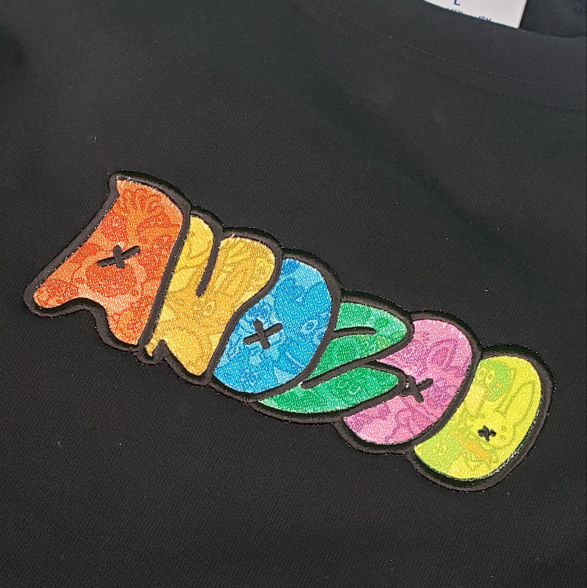 一見シンプルなロゴの刺繍トレーナーですが、よく見ると文字の中にキャラクターたちが隠れています。